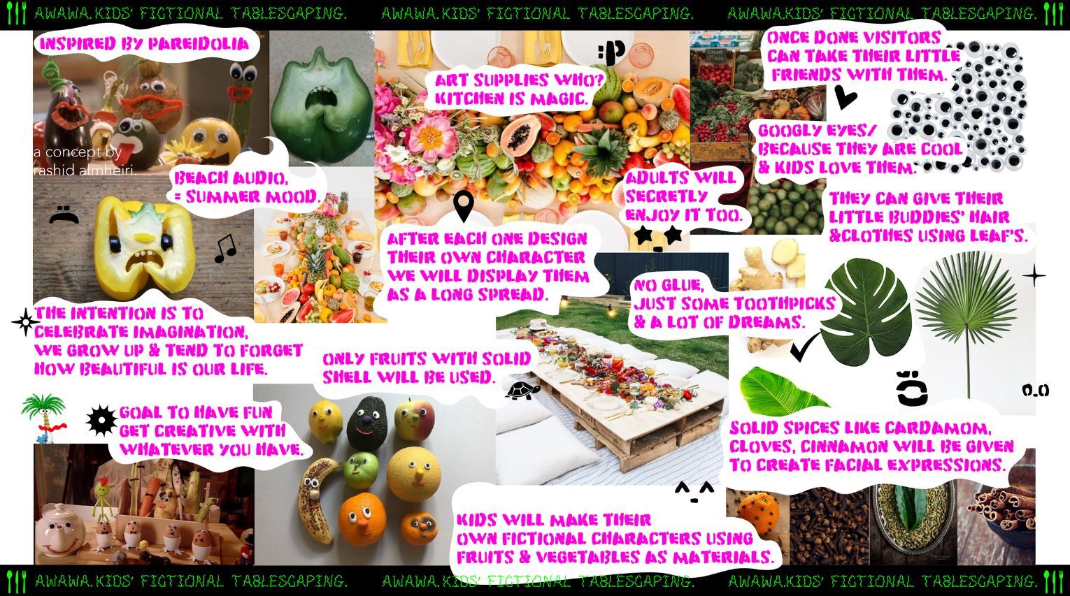 Inspired by pareidolia, kids will make their own fictional characters using fruits, vegetables & solid spices as materials. The intention is to celebrate imagination: we grow up & tend to forget how beautiful is our life/ mind. After each one designs their own character we will display them as a long spread. Solid spices like cardamom, cloves, dried lemon, cinnamon will be given to create facial expressions. Only fruits with solid shell will be used. Like coconuts, watermelon, oranges, lemons, etc. No glue, just some toothpicks & a lot of imagination.