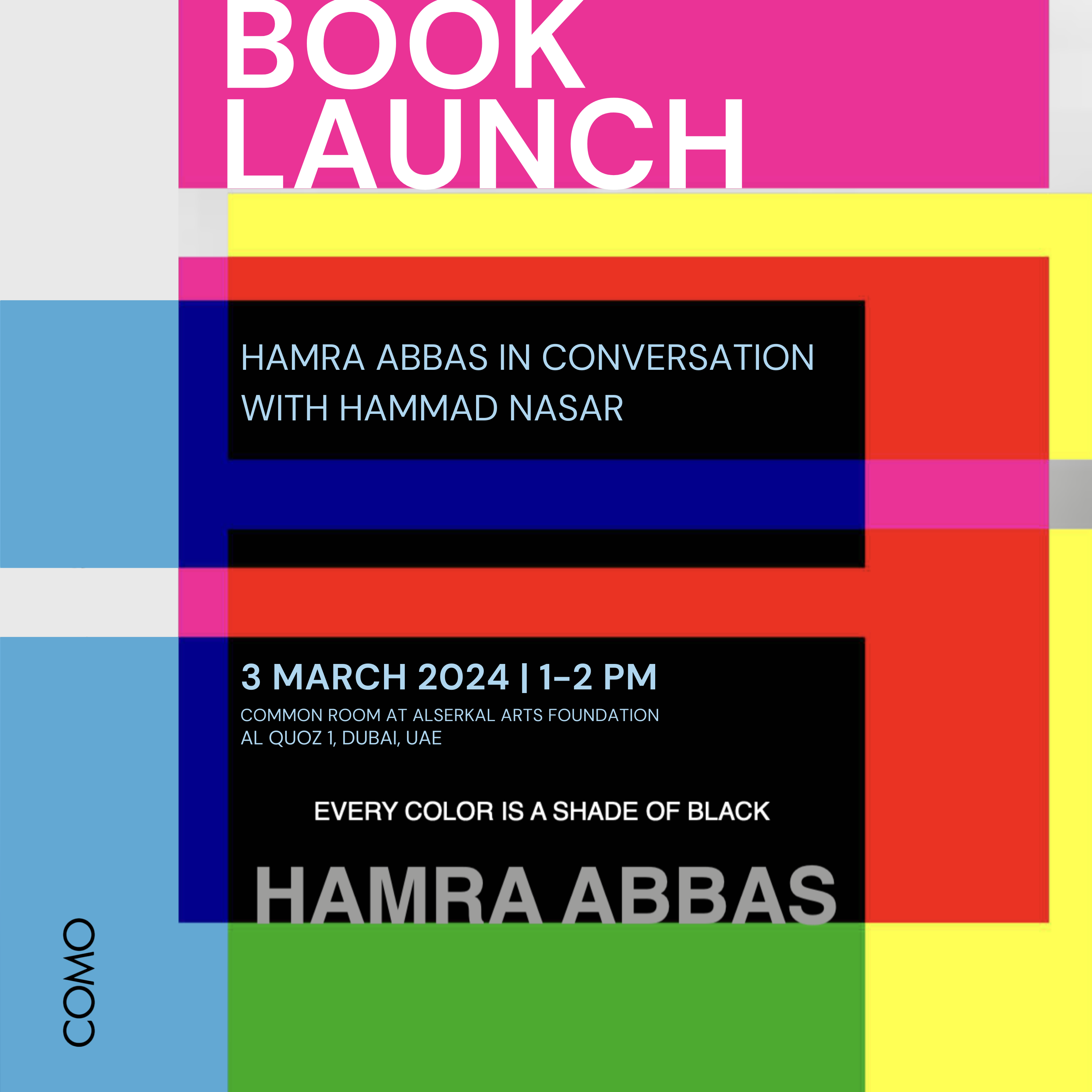 Join us for a dialogue between artist Hamra Abbas and writer Hammad Nasar, marking the launch of her monograph "Every Color is a Shade of Black" published by COMO Museum of Art in Lahore, Pakistan. Delve into the diverse realms of Hamra Abbas's practice—a portal to many worlds. Brace yourself for a full-body experience. With over two decades of an exploratory approach, Abbas poses thought-provoking questions that linger like pebbles in a shoe. Discover her dynamic and ever-changing approach across material, technical, and affective dimensions.