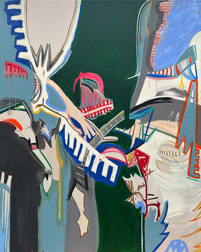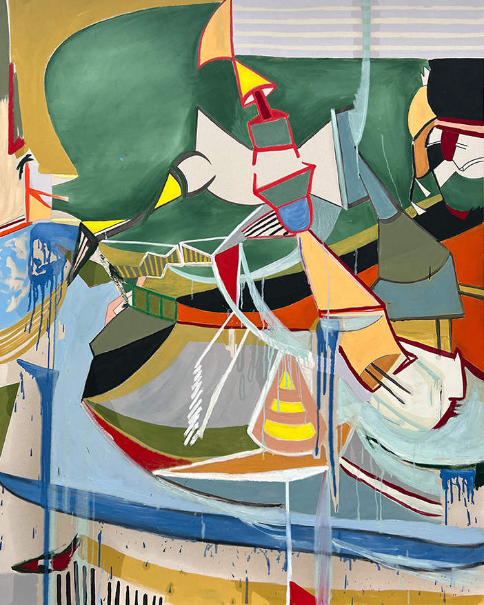 Charlie Lewis Marffy is interested in painting that is true to the experience of living, breathing and failing. In his paintings, Lewis Marffy seems to offer glimpses into a subliminal world; a place that is rife with confusion, contradiction, and ambiguity. It is conjured through an intuitive immediacy that incorporates its afflictions and derailments into something psychologically challenging. A peculiar darkness is slowly unveiled under the veneer of a ludic sensibility. It is an unfamiliar non-representational space that provokes the imagination with the indication of something internal and personal. The viewer, much like the painter, is invited to navigate the painting as a mental map in the same way an orienteer would. The divergent actualisations, absence of clear horizontal lines and spiralling overlapping forms work in the same way that a cartographer does when he flattens the earth’s surface onto paper.