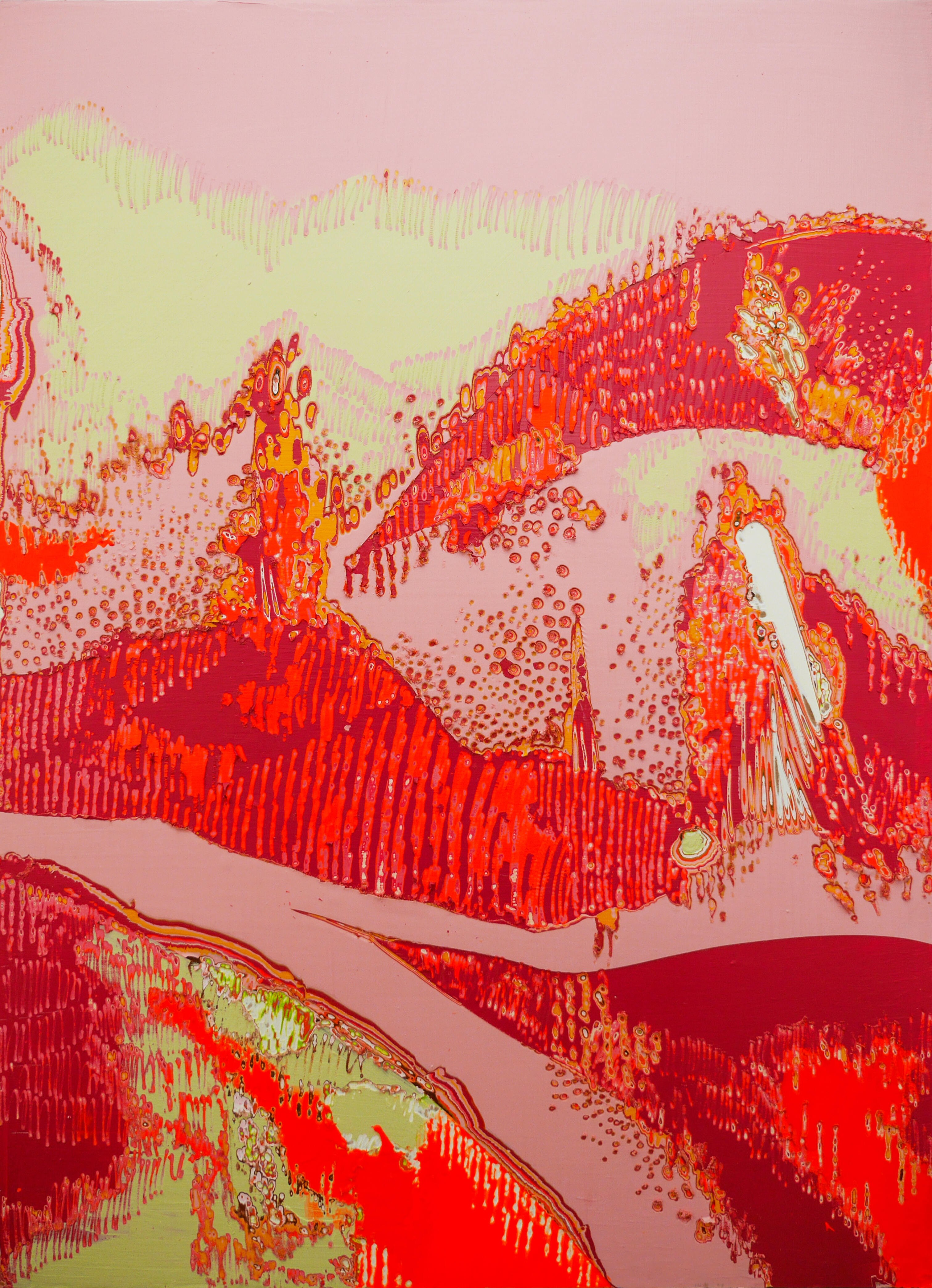 Curated by Myriam AlDhaheri, the exhibited series began in 2019, before the COVID-19 pandemic, with the piece entitled “And I think to myself, what a wonderful world” (2019). These 32 psychedelic works explore Alagroobi's process of making, and her relationship with materiality and memory. For the artist, the imaginary, a fictitious world of contemplation, pivots into real-life questions of displacement, splintered realities, and ownership of expression. Her works from this series of paintings are sculptural in nature, tempting the viewer to lean in further to examine the detailed layers of acrylic paint and resin. Alagroobi begins each painting by selecting a range of pigments that convey her emotions and imagination and starts the laborious process of applying up to a hundred layers of paint onto canvas or wood. Each layer of colour represents an abstracted memory and, as she waits for the paint to dry, stays present with her and swirls around her mind in undulating shades of light. Once reconciled with that coat of memory, she begins the next layer, selecting another colour, another level of self and continues to build layer after layer of thoughts, memories, pigments of past and present. The sculpting of the paint can take months of work and is only finished when her relationship with the canvas is reconciled. Alagroobi names her canvas once the “polarity of subject and object are dancing in tandem with each other”.