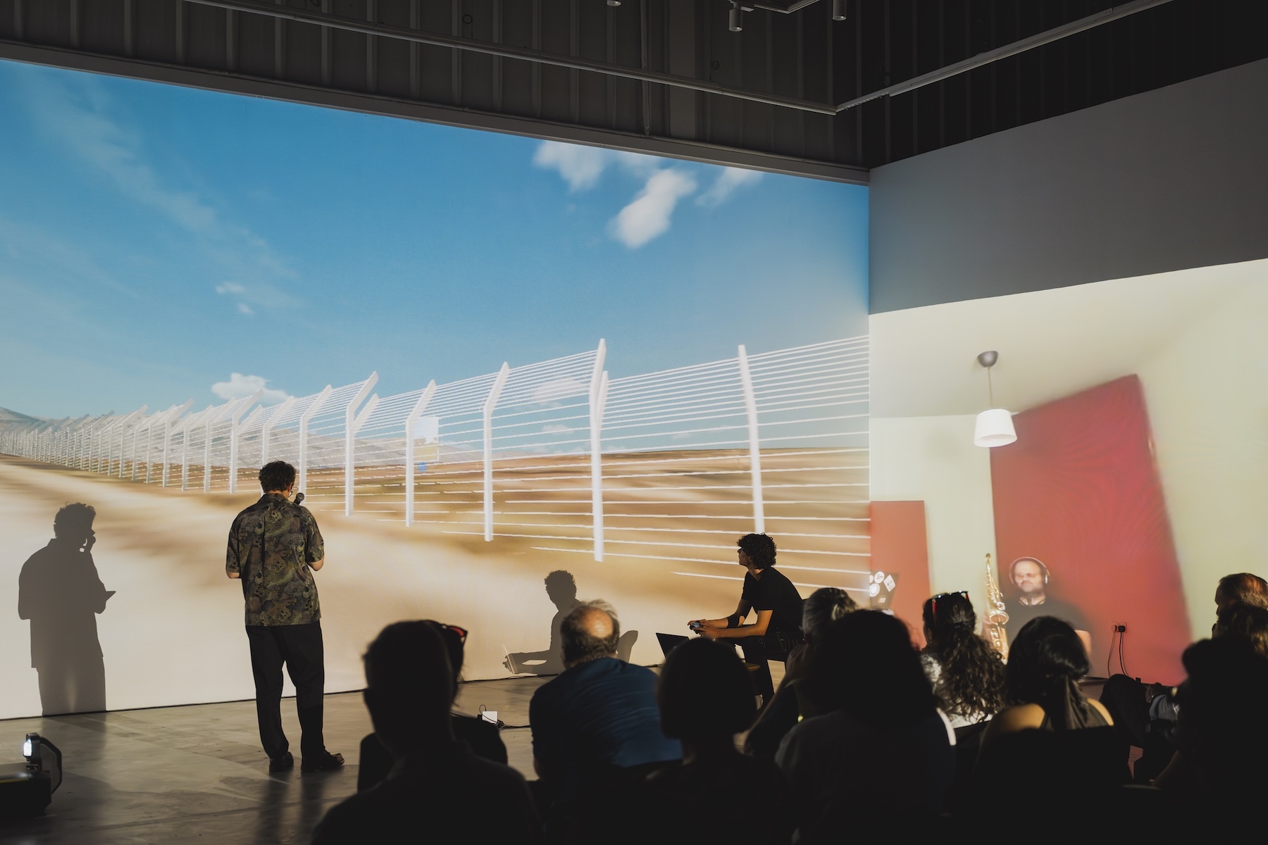 During this performance, the simulation was used as a musical instrument, a tool that acoustically guided the audience through this landscape, unfolding a story of dispossession and resistance. The sounds from this simulation were accompanied with live music performed by the saxophonist Amr Mdah and scored by Busher Kanj Abu Saleh, both renowned for their work in Jawlani band ‘Hawa Dafi’ or Warm Air.