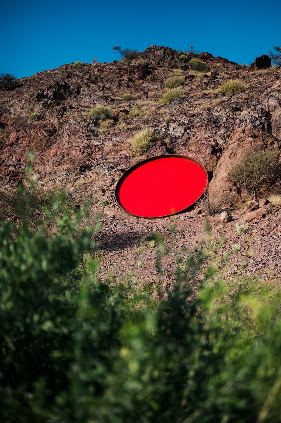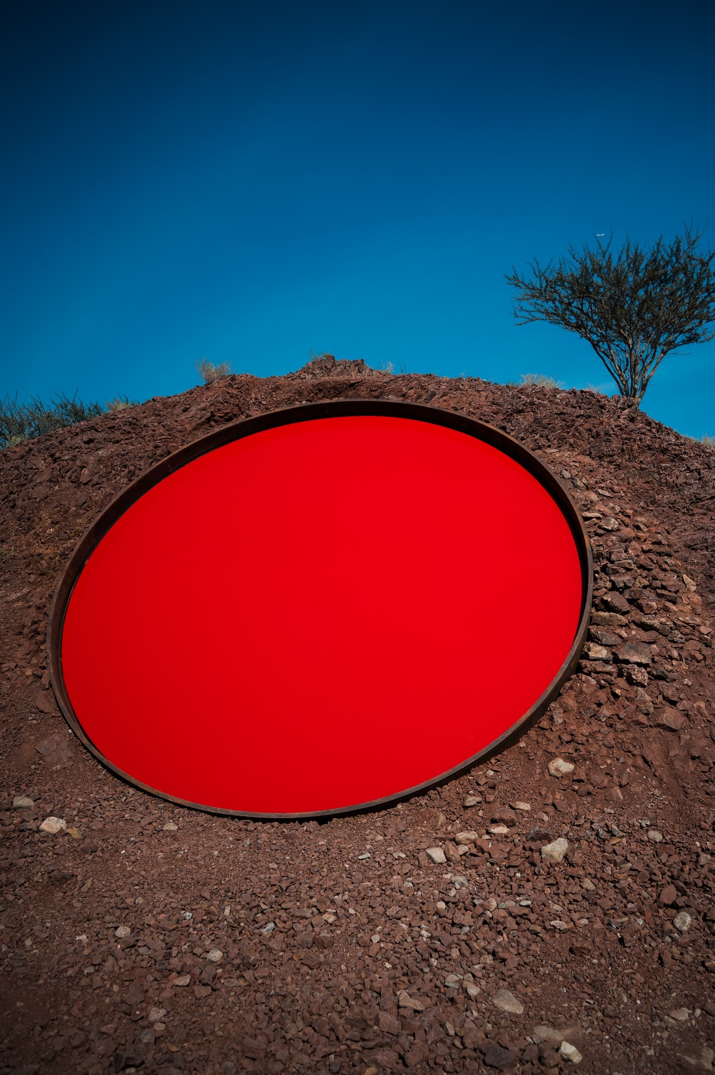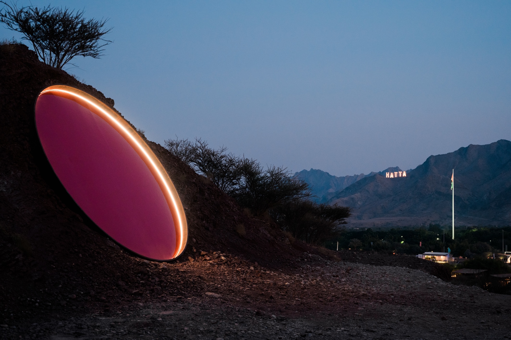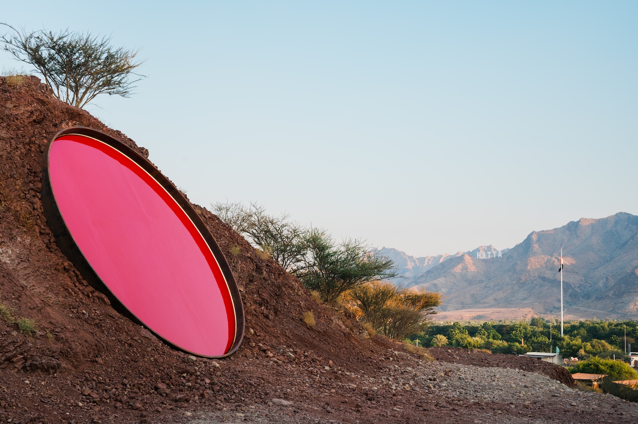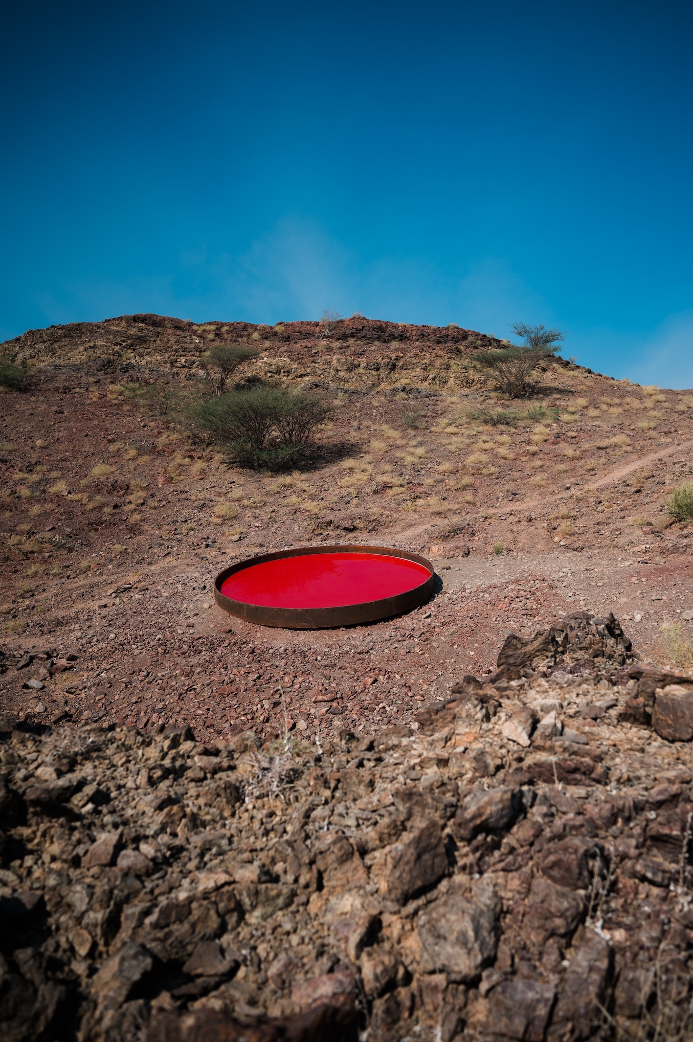 To encourage us to walk deliberately through Hatta’s landscapes, rousing our curiosity about our collective natural heritage and its continued transformations, Al Mazrou tenuously embeds five red discs into the earth, sometimes vertically, and at other times horizontally, as the discs sometimes negotiate with the landscape’s intricacies and idiosyncrasies, and at other times amplify them. Strategically located along a hiking path, each disc invites a different interpretation from the people interacting with it: They become beacons, drawing the visitor closer; portals through which the visitor is invited to be fully immersed within the landscape, and places that invite pause, directing the view towards the wider landscape within which Leem Lake is embedded.