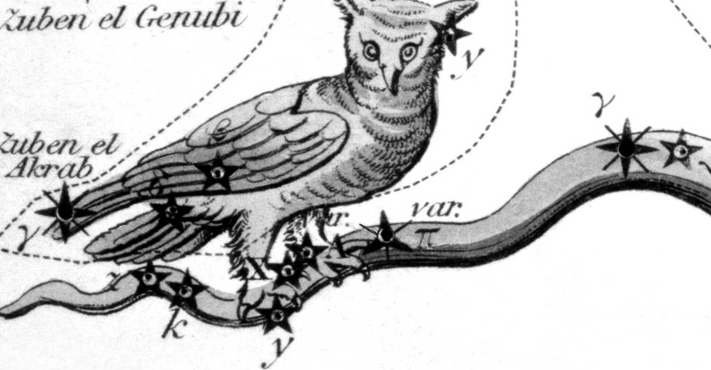 The constellation Noctua the Owl, plate 32 of Urania’s Mirror, 1824