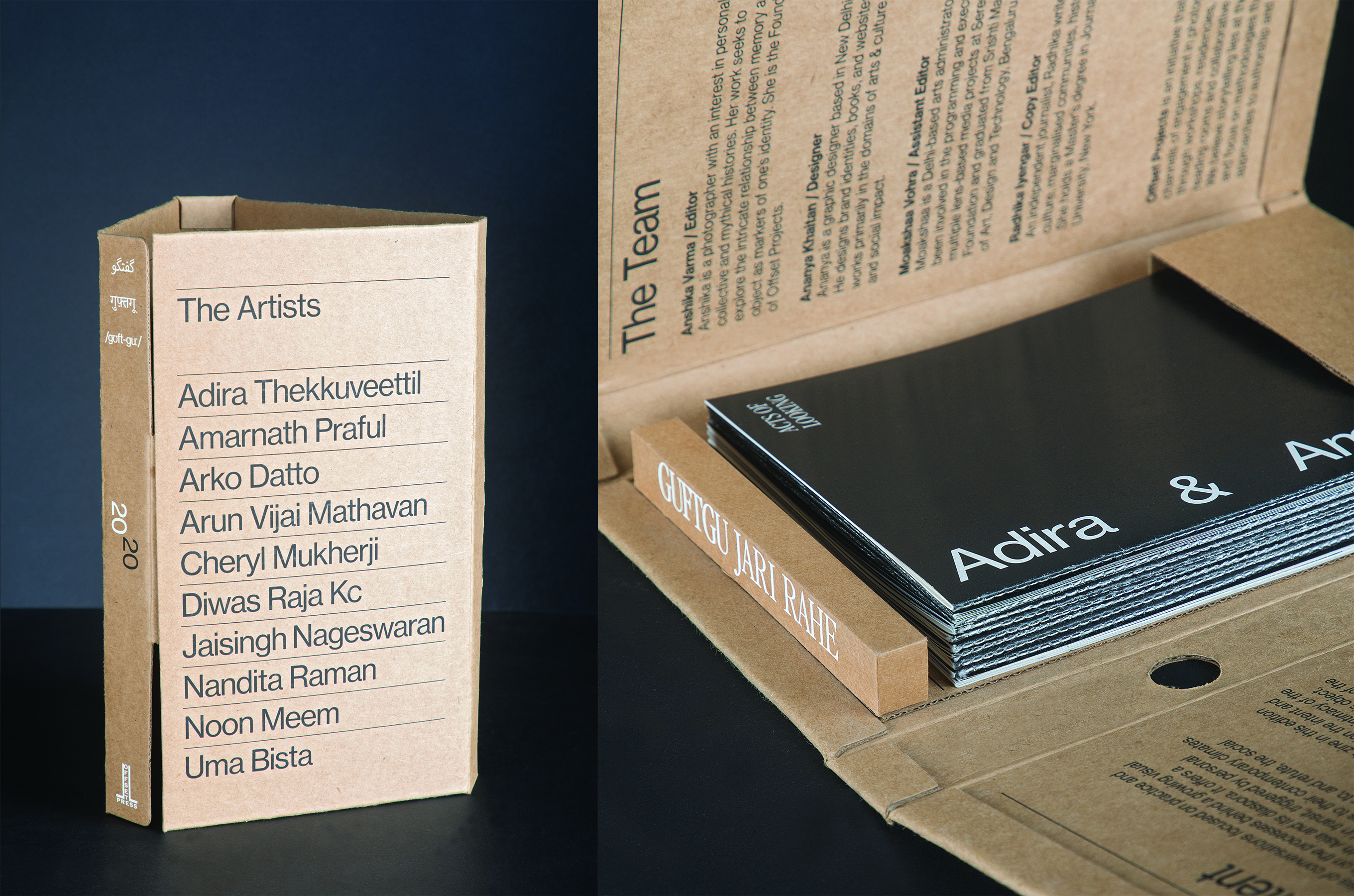 The curatorial premise ofGuftgu included inventive means to reduce production costs. The cover was a box made from packaging material, printing was done digitally on standard paper, and the design was done by a friend at a reduced fee. The result was something that did not feel precious. The second print edition of the book employed offset printing, screen-printing, and debossing, but since the design was repurposed and the book printed on unbranded paper, the cost of production remained low.