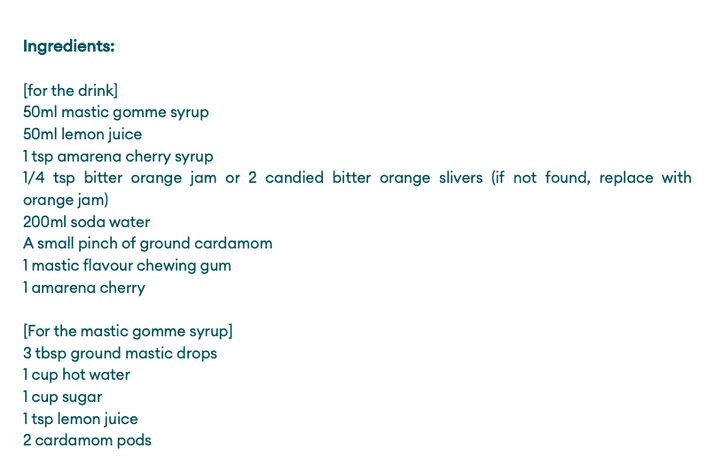 I employ mastic as an ingredient in a drink that is meant to be refreshing, juxtaposing it against other ingredients such as preserved cherries and bitter orange jam. These canned fruits are examples of foreign produce that have been imported/transported into the Gulf by expats around the 1960s and 1970s due to the inability to grow them in the desert environment at the time. These foods often carry flavours of home to those transporting them. Canning and preserving food also stretch its functionality over time, to ensure it stays edible over a longer period. Along with a hint of the Khaleej-ubiquitous cardamon flavour, this balances out the temporariness of the mastic, a component intended to last for a limited time.