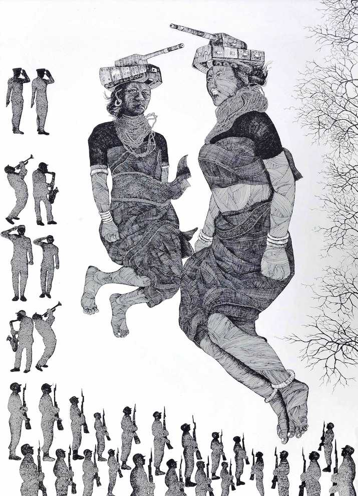 Through this show, Campbell Betancourt also aims to put forth the idea that ‘sensitive spaces’ are no longer exclusively physical—exploring the impact of social media through the work of Kanak Chanpa Chakma, whose oil on canvas pieces and photographs, Soul Piercing, document the infamous Ramu incident of 2012, during which mobs torched and vandalised a Buddhist village in retaliation to a Facebook post from an account under a fake Buddhist name that allegedly defamed the Holy Quran.
