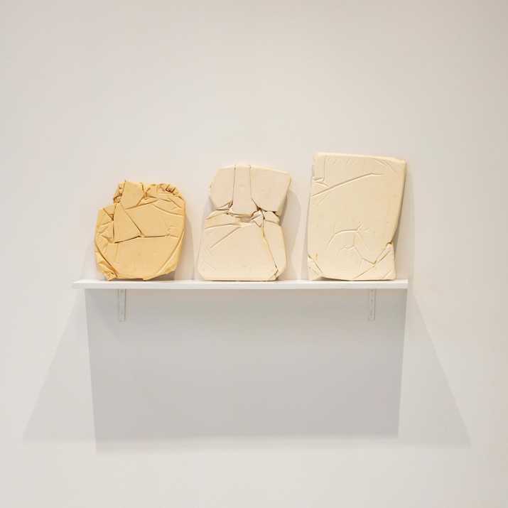 For Ahli, A Feeling Untitled (2020) is an abstract, stifled female body—female perhaps because of the ways in which she uses her whole body to make and mould the work. If so, it is a gutted being of mangled organs. Using a similar process—long balloons wrapped in a zip lock bag, then dipped to make a mould out of alginate—is a minimal array of what appears to be spinal discs, disconnected and arranged forensically in Collection of Bones: A Spine (2021). Together they form an image of paralysis. When the plaster dried, she says they cracked like bones. Her work points to an unmooring, a dissolution of parts rather than the containment she strives for by filling things up and removing the air from around them.