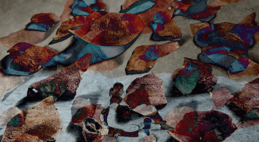 Using the program Pixelsynth, Alawadhi transformed the image of a text into a harmonious sound that contrasts with the intensity of ingesting a raw onion. Both text and body here are redacted—cut with solid black geometric shapes—the mouth extricated from the rest of the body. But while the text is abstracted visually in Rhythmic Eating, her skin close-ups are hyperreal.