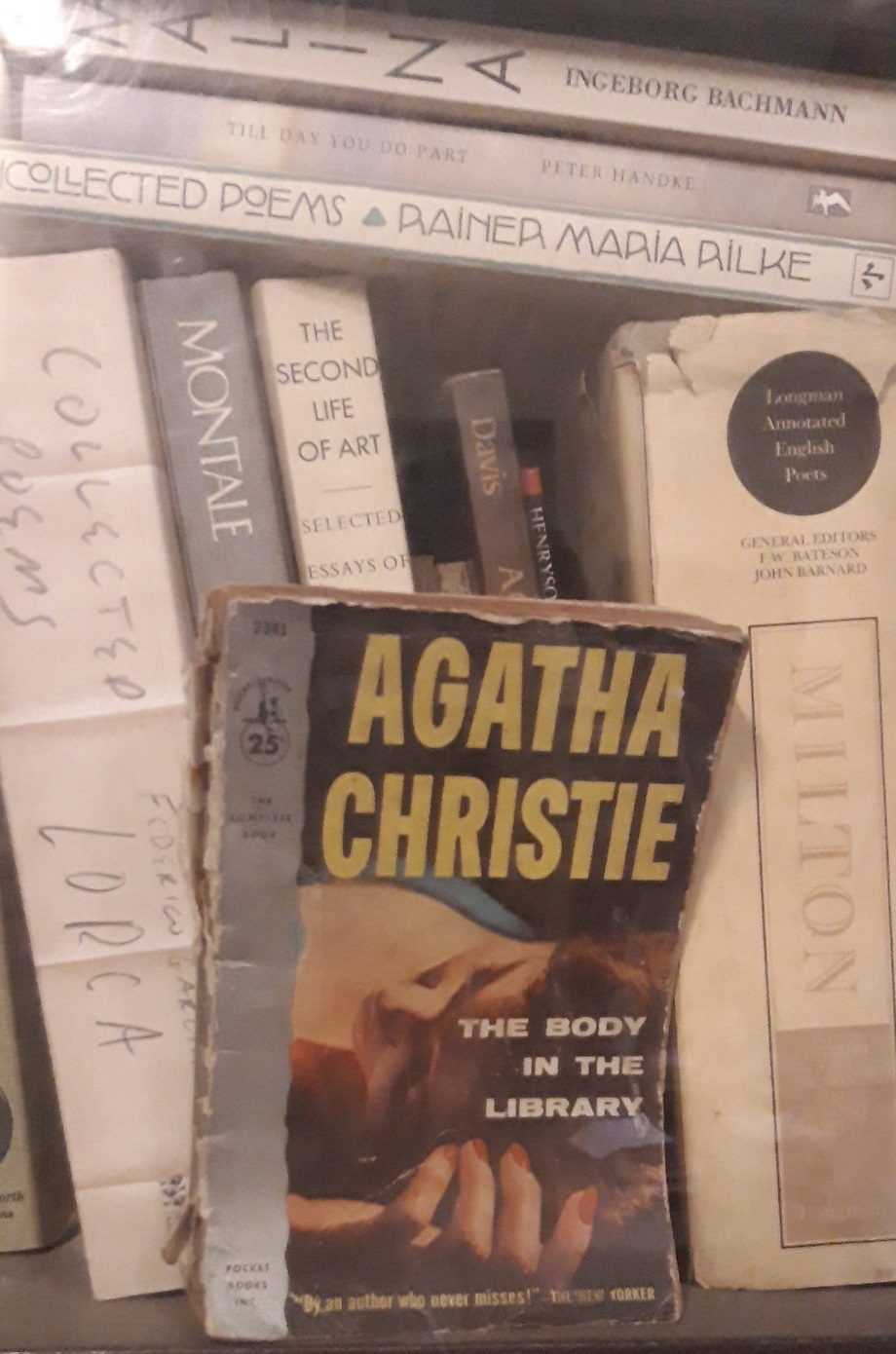 Having grown up on a steady diet of my grandparents’ Agatha Christies, The Body in the Library was the title I had chosen for my ‘installation,’ inscribed on the wall at the entrance to my space. It had an open doorframe without a door, through which visitors would drift into my chamber, looking slightly awkward and unsure of themselves because of my working presence in it. I decided not to make them feel entirely at home. The secret was to wear the right mix of benign indifference and polite curiosity on my face. This wasn’t difficult because, having grown up in a vast and boisterous extended family, it took me little time to get into my work in the absence of privacy.