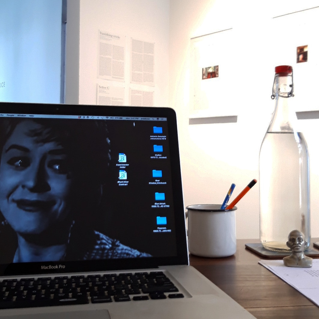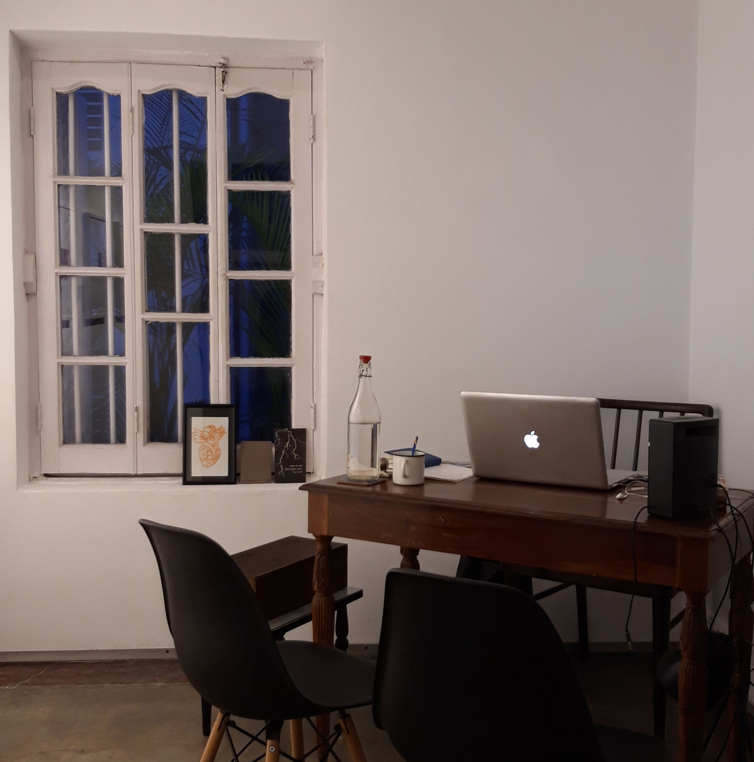As the writer in the show, I was given a room to myself, which I set up as my work-station. There were two chairs on either side of a writing table with a lamp and a small Bluetooth speaker on it, posters on the walls, coffee-making stuff, and shelves full of books from my own library. The other participants were represented by their work. I was the only one physically present there for most of the three months or so that the show ran. Every day, I would bring my laptop and notes, sit at the table and be The Writer, doing what I would do in my own study at home, including a brief post-lunch snooze with my head on the table.