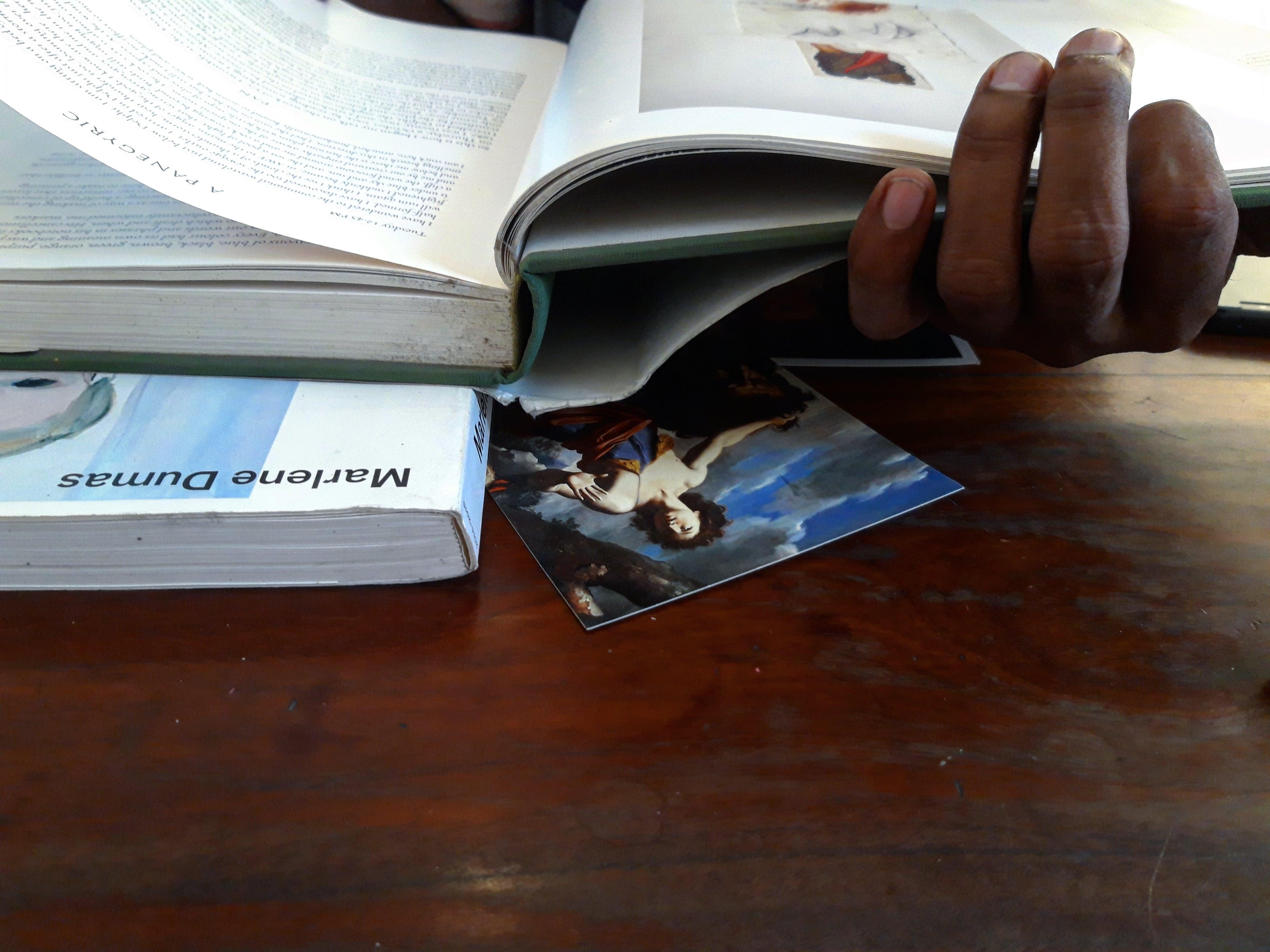On the wall next to the shelves of books, I had scribbled an invitation for visitors to remove the books and read them, provided they put them back with all the stuff in them before leaving the exhibition. I annotate my books heavily and use them as storing places for random bits of paper I don’t have the heart to throw away. Some of these books are irreplaceable and mean a great deal to me. But I thought that putting them out like this would be the risk I’d take for the sake of this work. I don’t regret having done this. To this day, I discover little notes written by visiting strangers tucked in some of the books, relaying how much they had enjoyed their encounter with the books and the personal matter written or kept in them. Next to my instruction on the wall, I stuck a postcard of Holbein’s sketches of Erasmus’ ink-stained hands.