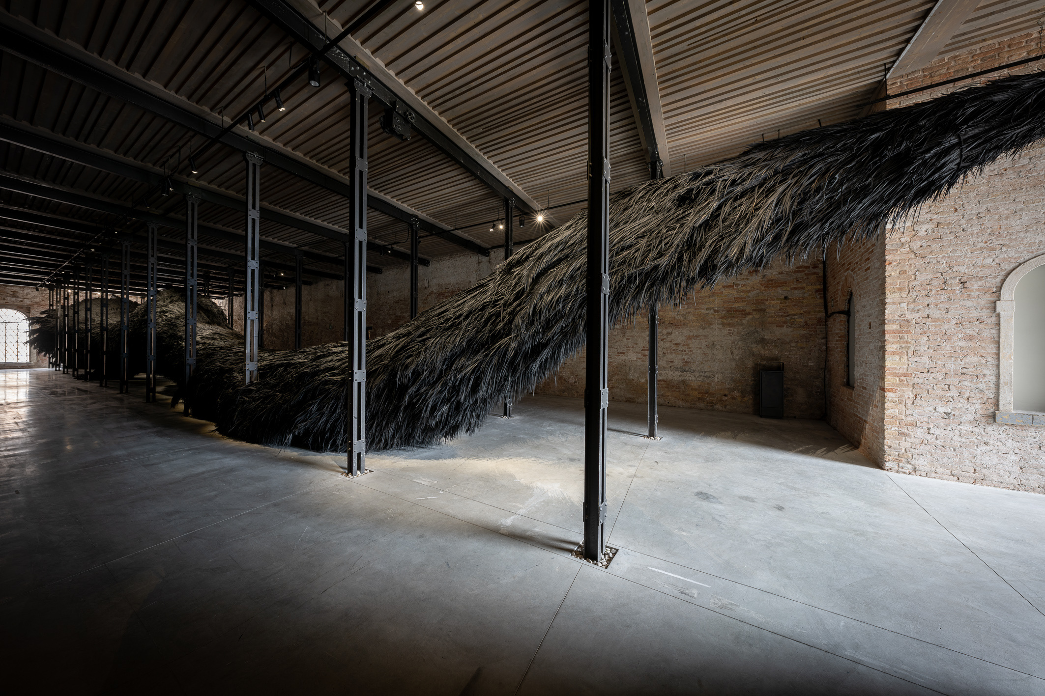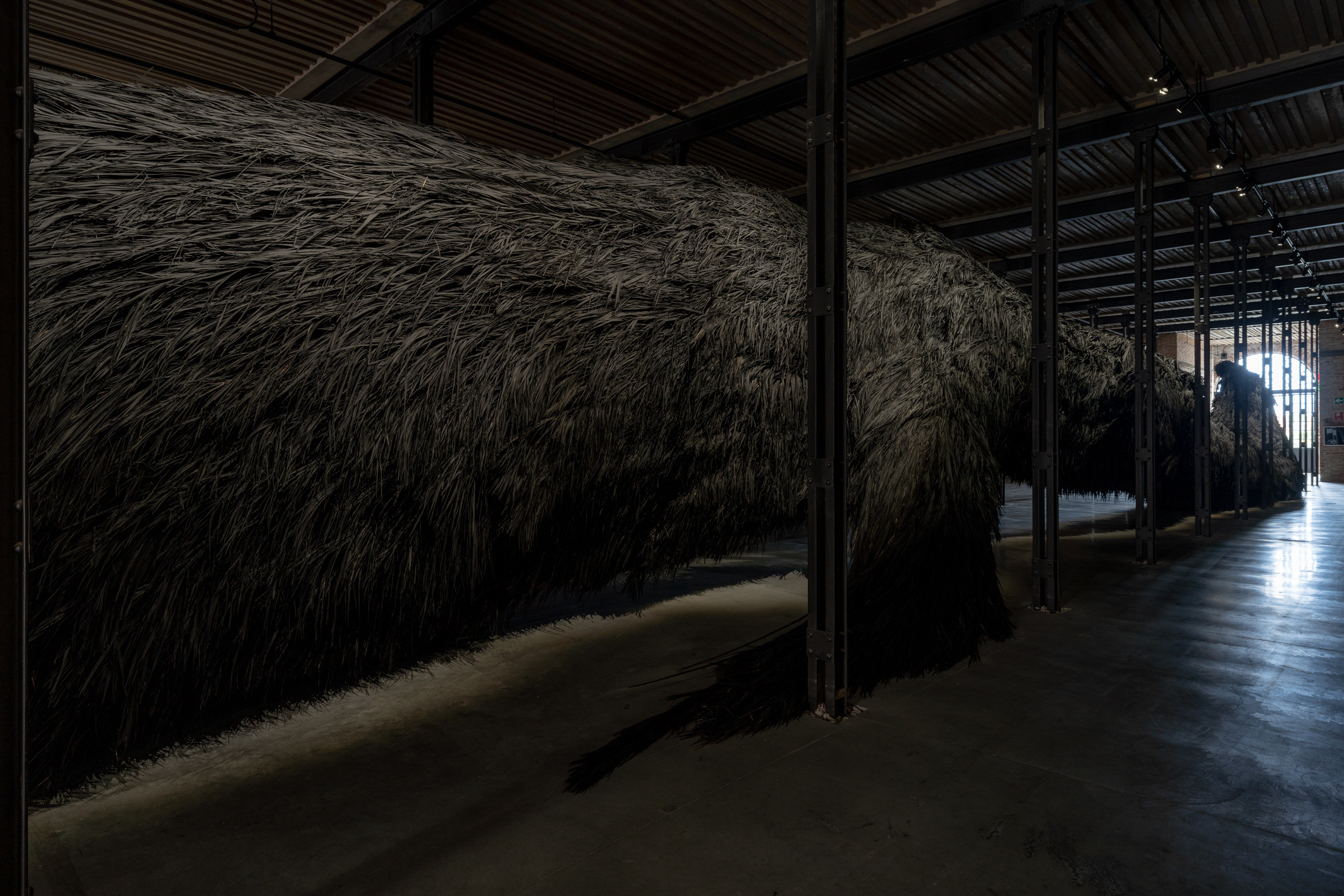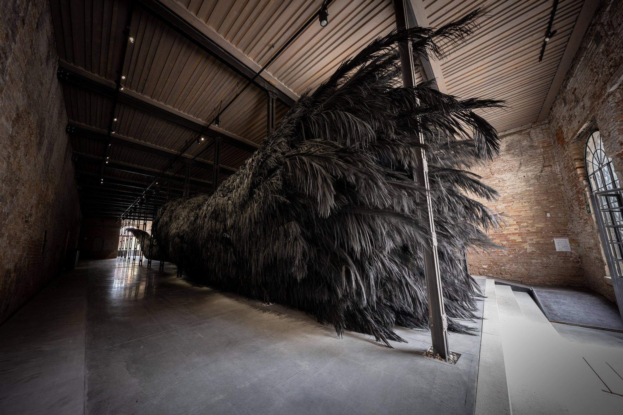 Among the three pavilions representing the Gulf region, the Saudi pavilion, entitled ‘The Teaching Tree,’ made a compelling statement. A solo presentation by Muhannad Shono and curated by Reem Fadda, this massive installation of black palm fronds snaked through the space like an otherworldly creature. Emerging from the artist’s fascination with the line and mark-making as acts of creation and regeneration, Shono envisions Al Khidr - a mystical guardian of the sea in Islamic tradition - when he conceived the ceiling-high gargantuan sculpture. Although the word ‘khidr’ translates from Arabic as ‘green’ or ‘verdant’, here it feels like an evocation of charred nature.