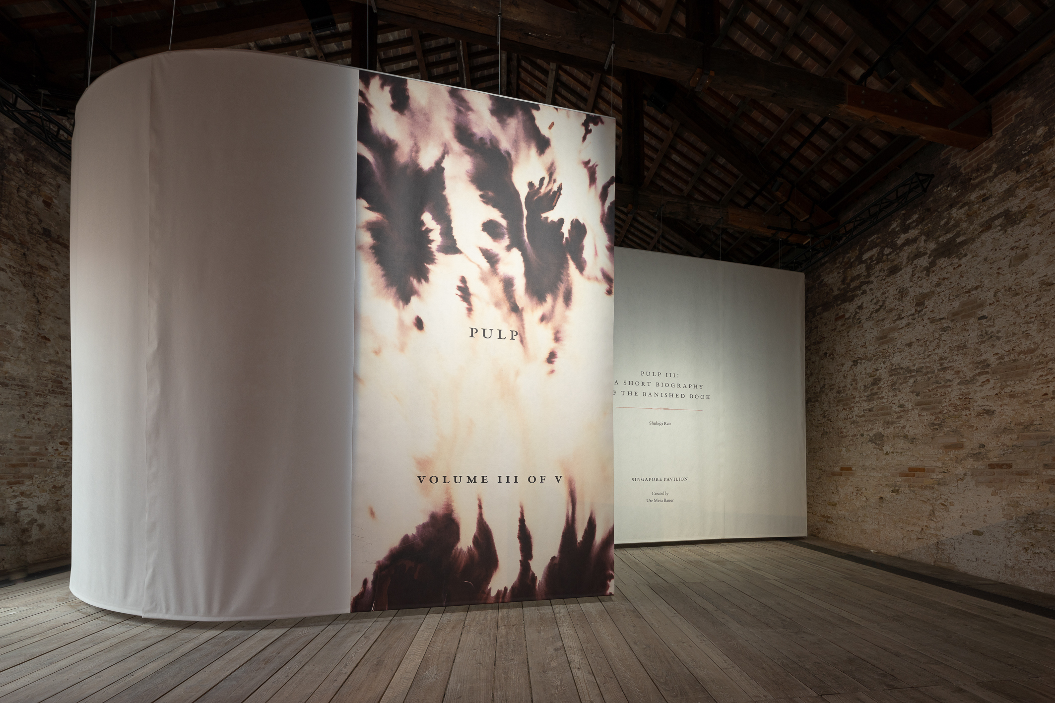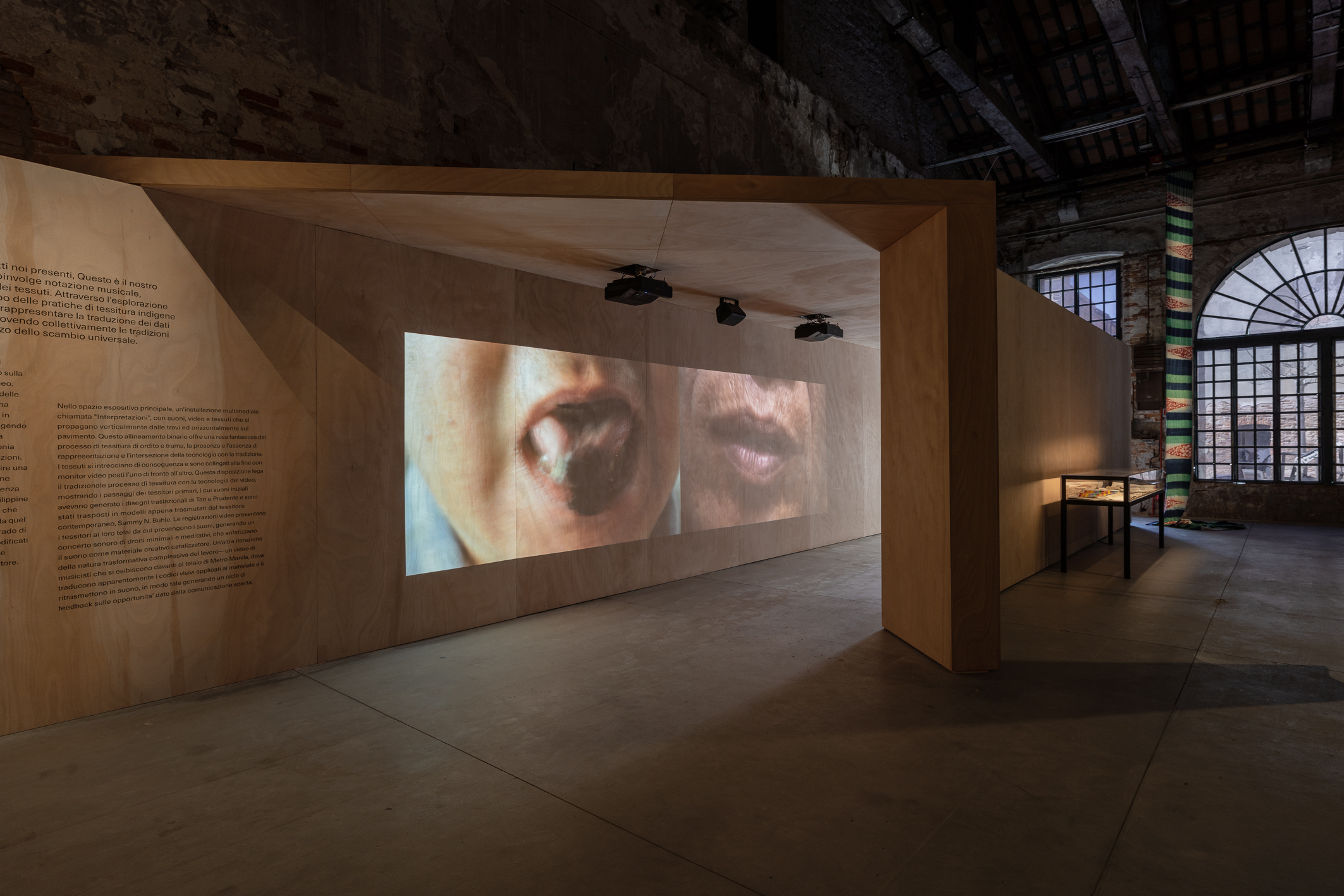 Other pavilions that stood out included Singapore and the Philippines. Taking the form of a paper labyrinth or a wall-high open book, Singapore’s ‘Pulp III: A Short Biography of the Banished Book,’ curated by Ute Meta Bauer, featured Shubigi Rao’s lyrical and visual testaments to destroyed libraries and endangered languages. The Philippines pavilion, ‘Andi taku e sana, Amung taku di sana/All of us present, This is our gathering,’ was wonderfully sensorial. Upon entry, a video projected the artist Gerardo Tan performing a celebratory chant from the Cordillera region of the Philippines by transcribing its musical notations in squid ink with his tongue. In a central multi-media installation, field recordings of indigenous weaving practices were transmuted into textile designs, where sound responded to the act of weaving in a culturally coded form of communication. Exploring sonics as all forms of material, this was a pavilion no voice note could adequately encapsulate.