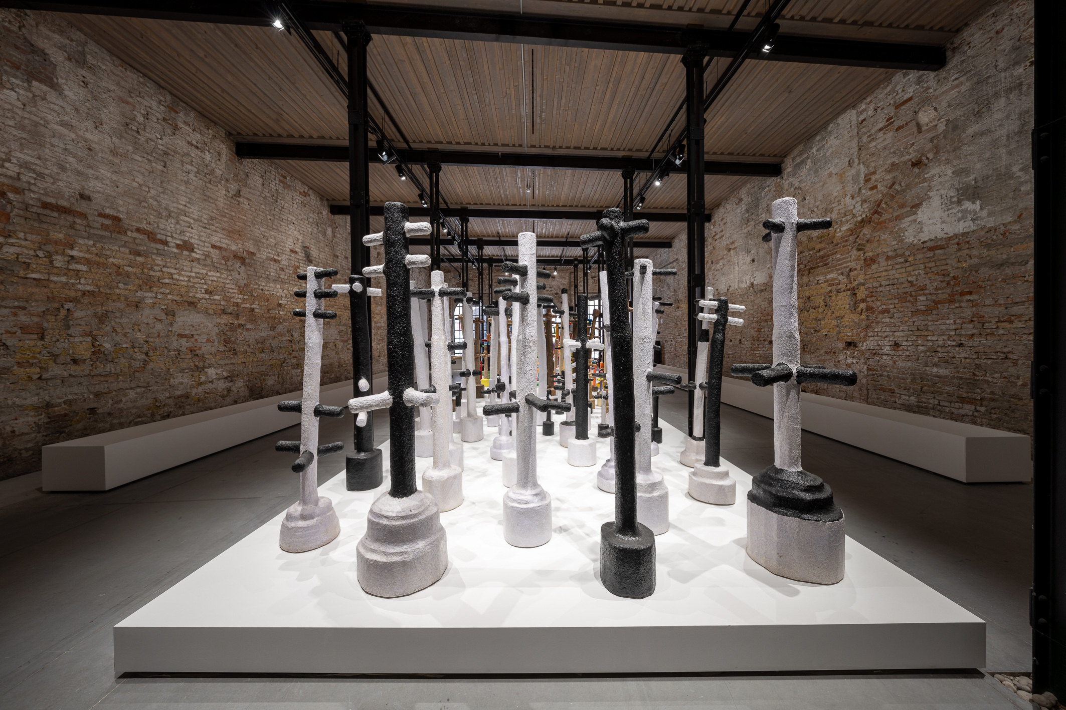 The work was a series of papier-mâché twig-like sculptures in gradations of colour presented on a large plinth. In rows, the sculptures went from not-so-subtle pop colours to organic brown and then black-and-white, indexing the movement of the sun. The impact of Khor Fakkan’s mountainous environment on Ibrahim’s land art is well-noted here. I wondered what the playful-looking sculptures might look like if they were hanging from the ceiling, or if they were to engage with the grand spaciousness of the Venetian pavilion, instead of being stationary on the floor. I spoke to Ibrahim about the lesser-known elements of his practice, such as his use of craft paper, dried grass, leaves, coffee, tea and tobacco and how he leaves the papier-mâché to take form via layers of wetness and dryness.